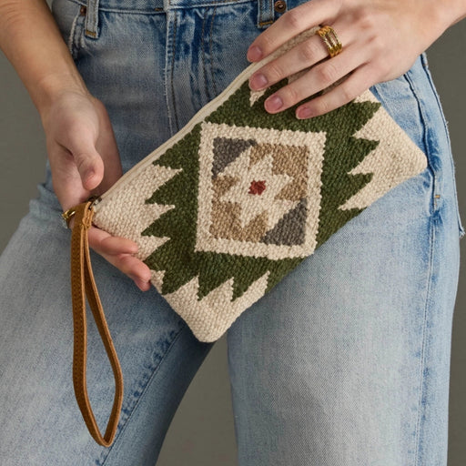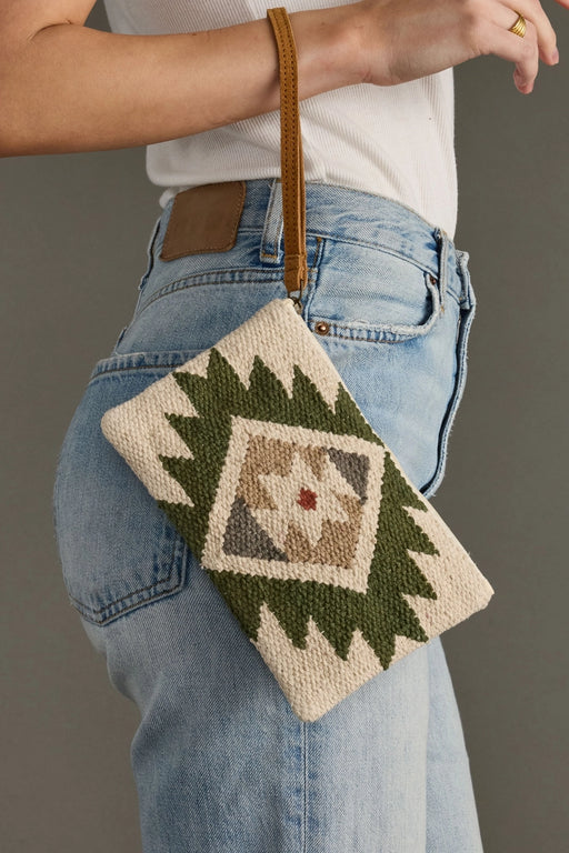 Cream, green & tan western-inspired wristlet Suede pull 5" x 8" 100% Cotton Lining: 100% Polyester