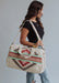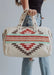 Beige, brown, red & lt blue Aztec duffel Zipper closure with interior zipper & 2 small open pockets 19" x 9" x 11" 100% Cotton