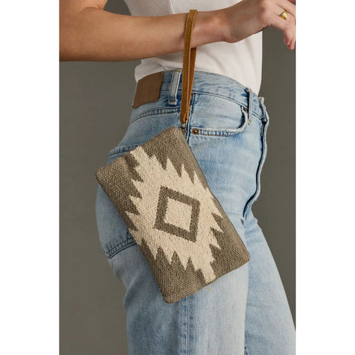 View full detailsTaupe & cream Aztec wristlet Leather pull 5" x 8" 100% Cotton Lining: 100% Polyester