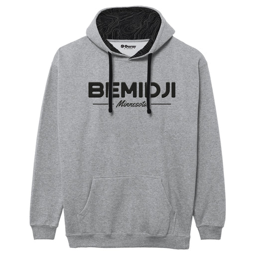 View full detailsTopography Bemidji | Unisex Hoodie Bemidji, Minnesota Gray hoodie, with topography graphic lining the hood. Bemidji, Minnesota stitched on front.