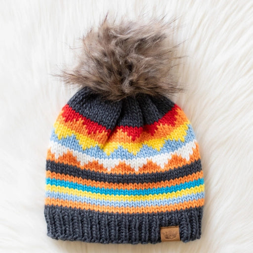 View full detailsBlack + Colorful Patterned Pom Beanie Natural faux fur pom accent Fleece lined 100% Acrylic