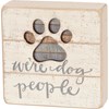 A slat wood box sign lending a "We're Dog People" hand lettered sentiment and a cut-out paw print design with inset striped coloration acce...