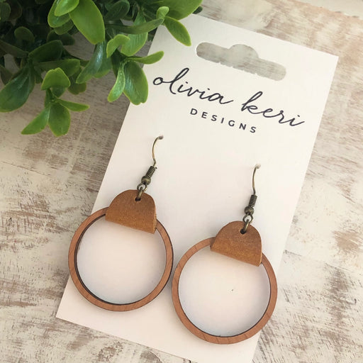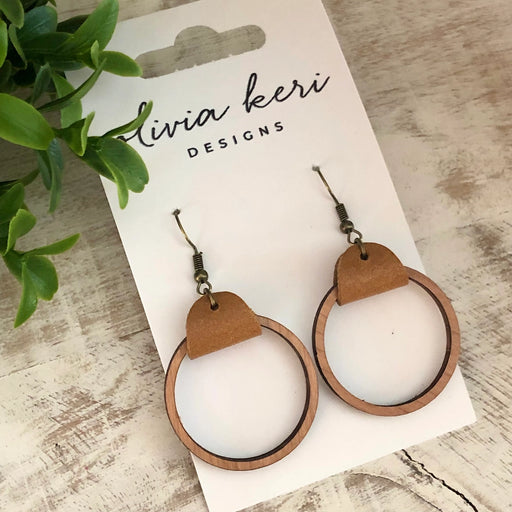 View full detailsFun cherry wood hoops with an olive accent. This listing is for one pair of earrings measuring 1.3". Ear hooks add approximately .5 inches in l...