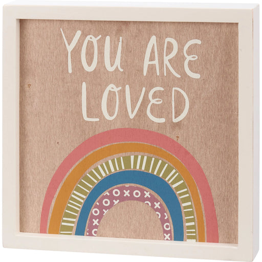 View full detailsA wooden inset box sign displaying block print art of a fun rainbow with "You Are Loved" sentiment on natural wood background. Box sign features cr...