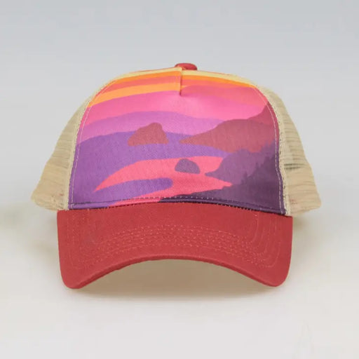 View full detailsSoft pink and a yellow trucker hat with desert sunset scene. Curved bill and snapback closure. Fits most 1-5 yr olds.