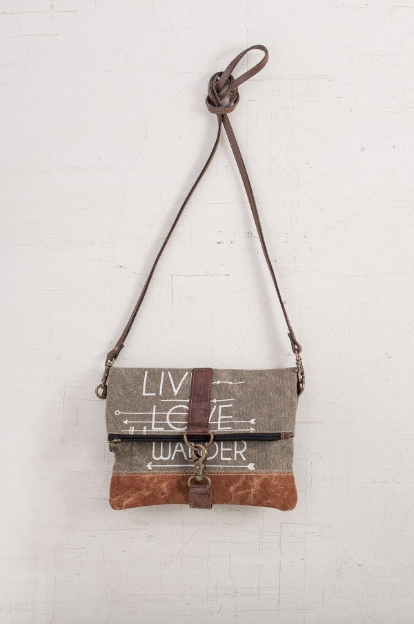 View full detailsThe Live Love Wander fold-over crossbody bag features a beautiful two-tone brown canvas with Live Love Wander stenciled on the front, a zipper top...
