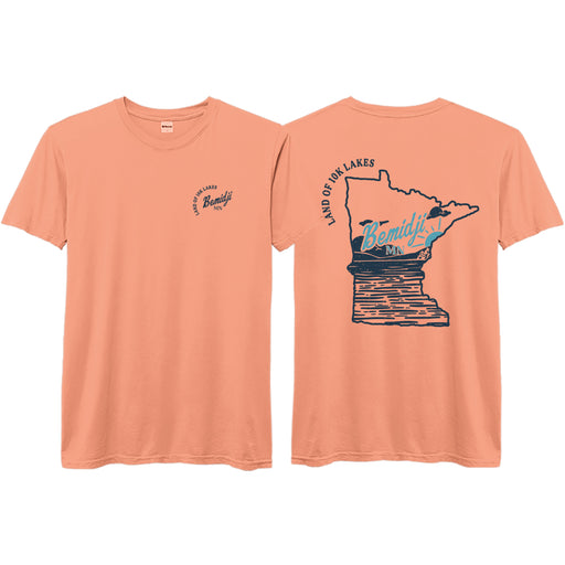 Soft unisex fitting tee with imprint on front left chest, and large imprint on back. Bemidji, Minnesota