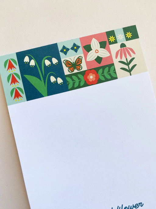 A list notepad displaying vibrant hand illustrated designs of flowers and butterflies surrounding a fun mom-themed sentiment that read...