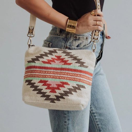 Beige, brown, red & lt blue Aztec crossbody bag Removable strap 8" x 12" x 4" 100% Cotton