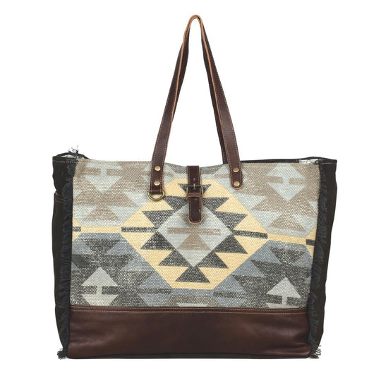 The woven canvas of this exceptional bag features a striking tribal-inspired pattern in soothing gray and white colors. Frayed edge treatments comp...