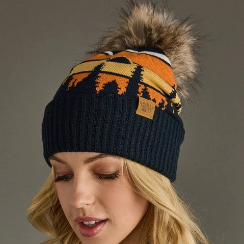 Dk. Navy Forest Landscape Pom Beanie Natural faux fur pom accent Fleece lined 100% Acrylic
