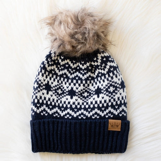 Dk. Navy + White Patterned Pom Beanie Natural faux fur pom accent Fleece lined 100% Acrylic