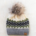 Cream, Green, Black + Gray Patterned Pom Beanie
