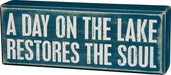 A wooden box sign featuring a distressed "A Day On The Lake Restores The Soul" sentiment that complements well with existing décor. Easy to hang or can free-stand alone.Size: 8"x3"