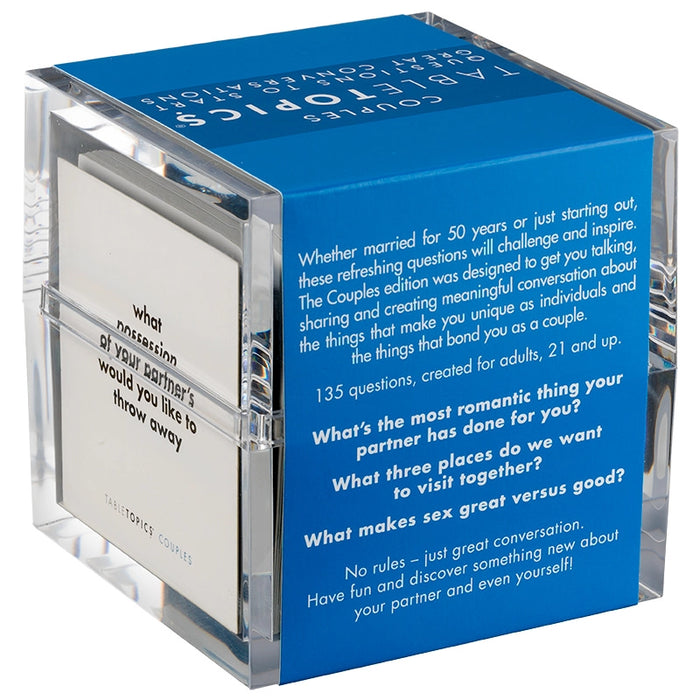 These refreshing questions will challenge and inspire a couple to learn something new about their partner and even themselves! A fun tool for couples to create meaningful conversation about things that make them unique as individuals and that bond them as a couple. 135 question cards in a 4" x 4" x 4" clear, acrylic cube. Ages 21 and up