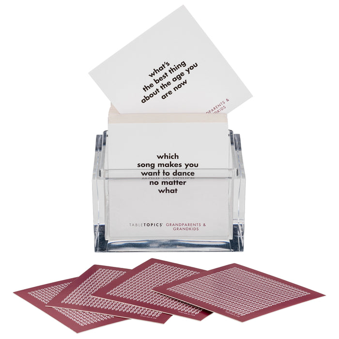 This edition of conversation starters will help grandparents and grandchildren enjoy getting to know each other better. The questions are designed to let you share all the important things—personal stories, fun ideas, plans for the future, and a good bit of laughter too. 135 question cards in a 4" x 4" x 4" clear, acrylic cube. Ages 6 and up