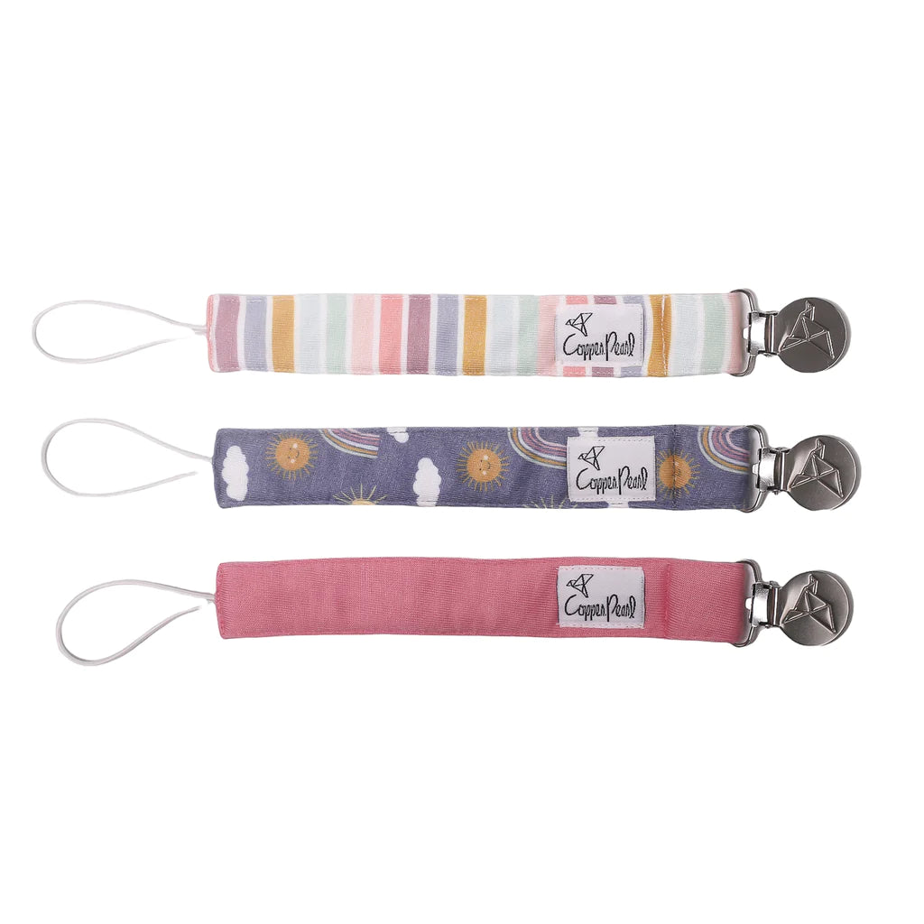 Offering the ultimate blend of fashion and function, our unique Binky Clip features a premium knit strap lined with absorbent fleece to help soak up drool. Simply attach baby's pacifier or teether to one end, then fasten the clip to clothing, blankets or baby gear. Oh, and by the way our set includes three Binky Clips to keep with you wherever you go - no more floor drops or pacifier pick-ups!
