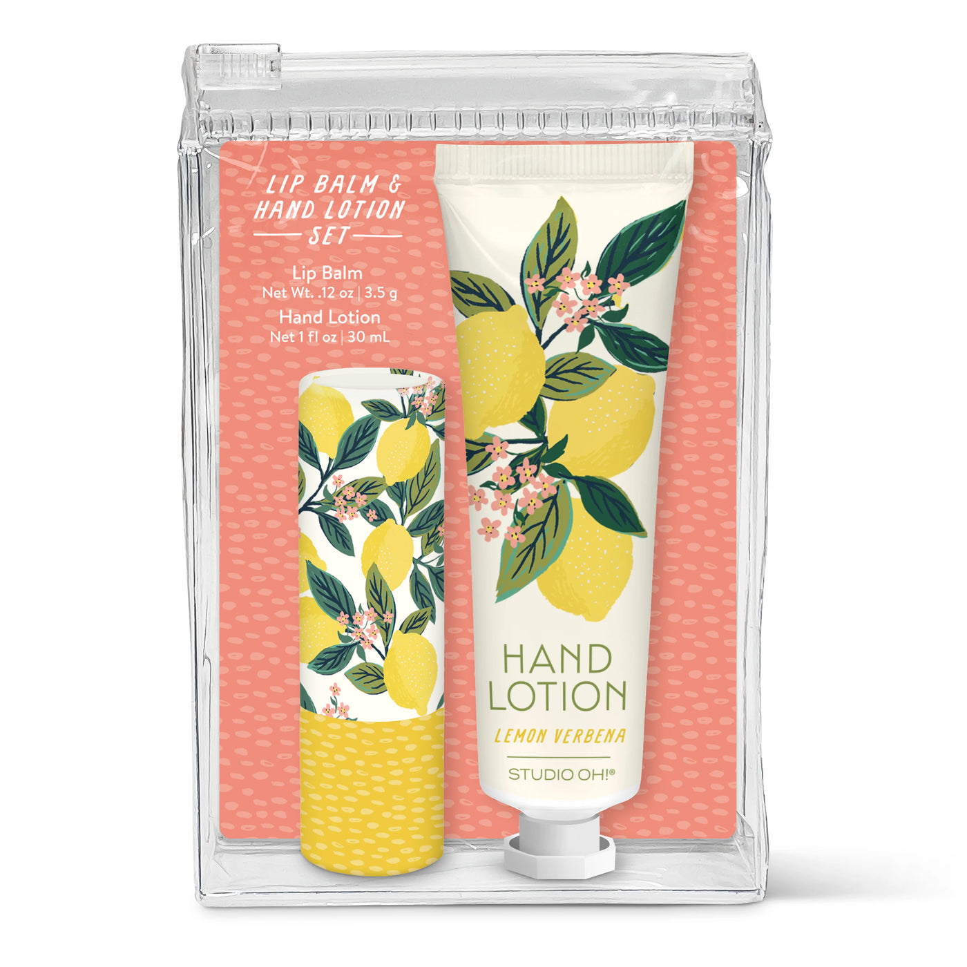 The Lip Balm & Hand Lotion Set from Studio Oh! includes a hand lotion and lip balm packaged in a clear, reusable pouch. The unscented lip balm helps gently moisturize and smooth dry lips, while the scented hand lotion hydrates hands and cuticles. The two-piece set is artfully designed and perfect for carrying in a handbag or gifting to a friend.