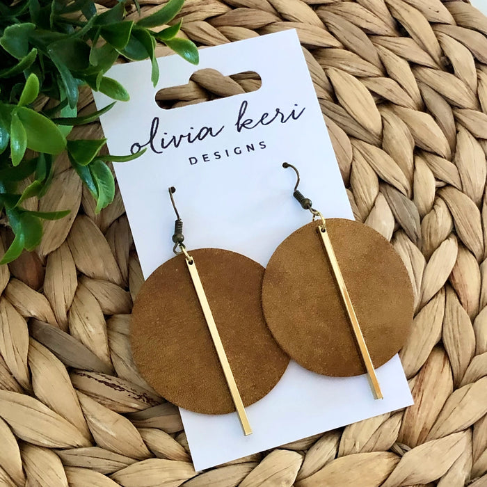 Beautiful camel round leather earrings featuring a gold bar accent. Earrings measure approximately 2” x 1.75”. Ear hooks add approximately .5 inches in length to the overall design. DETAILS *Genuine Leather *Antique Bronze Nickel-Free Wire *Rubber Backings Included *Earrings are packaged on a lovely display card.