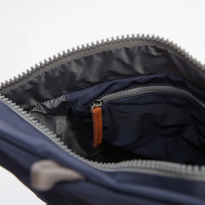 The Canfield comes in both Recycled Canvas and Recycled Nylon options. The nylon has a shiny look and smooth feel, and the canvas has a textured look and matte feel.