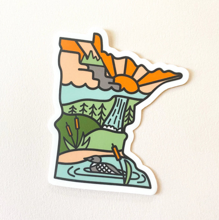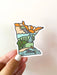 “MN” souvenir, local love sticker featuring line drawn scenes of the great state of Minnesota! Perfect for laptops, phone cases, journals and more. Waterproof and weather-resistant. Dimensions: 3 x 2.5 x 0 in