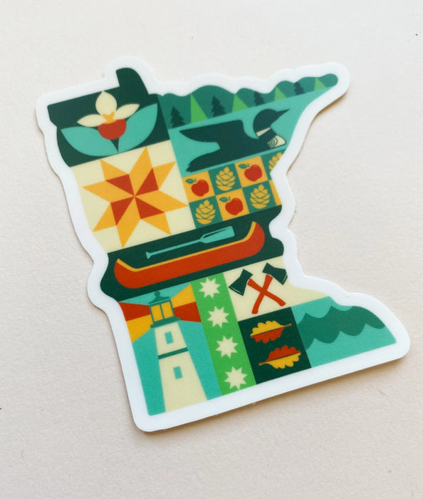 “MN” souvenir, local love sticker featuring a fun quilted graphic pattern of all things MN! Perfect for laptops, phone cases, journals and more. Waterproof and weather resistant. Dimensions: 3.5 x 3 x 0 in