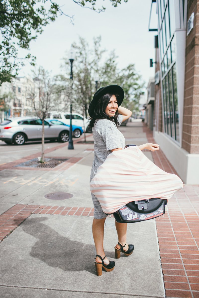 - Stretchy fabric fits most all car seats, shopping carts, high chairs and nursing mothers. It can also be a trendy infinity scarf! The blush colored fabric is trendy and perfect for your baby girl