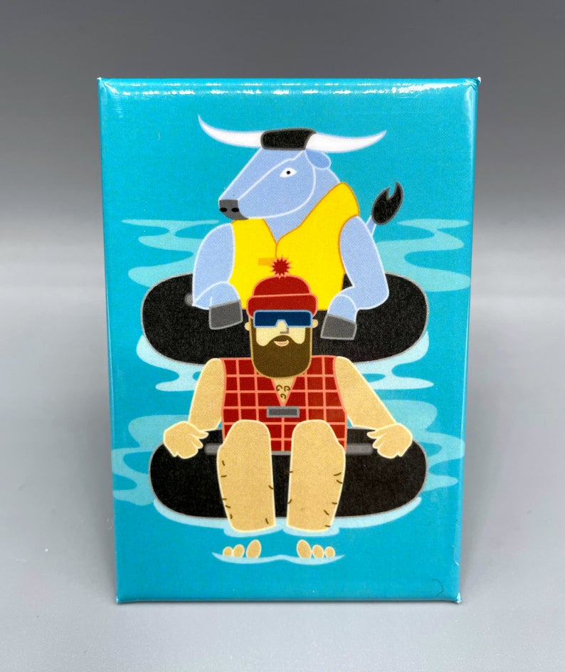 Handmade by Minnesota artist, Cindy Lindgren. Minnesota's most famous couple, Paul and Babe, tubing down the river. The 2 x 3" magnet is a high quality custom metal piece with a polished finished.