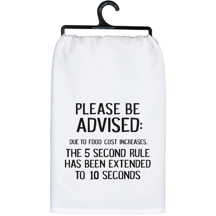 A black and white cotton kitchen towel displaying a fun hand illustrated sentiment that reads "Please Be Advised: Due To Food Cost Increases, The 5 Second Rule Has Been Extended To 10 Seconds." Our Be Advised kitchen towel is conveniently machine-washable for easy cleaning.