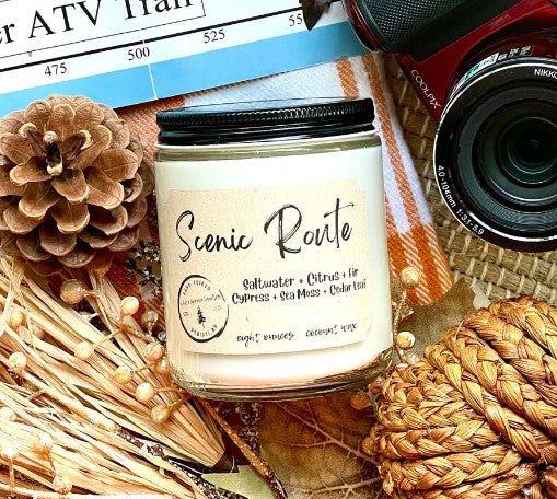 Pack your bags and head up north! The Scenic Route will take you to a fresh saltwater lake and then lead into a fir needle and cedar forest, with burst of citrus and sea moss along the way. A scent that brings the fall hike inside!
