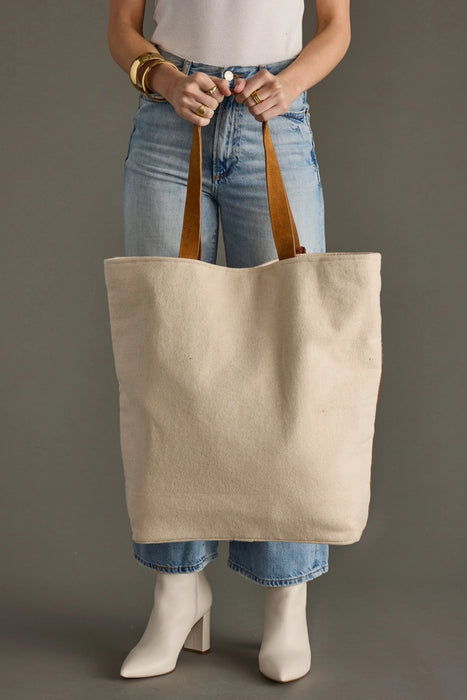Cream & multicolored scene tote bag Rust pom tassel 17.5" x 6.5" x 16" 100% Cotton