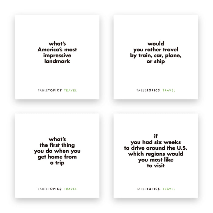 These fabulous travel-related questions are sure to entertain—whether in the air or on the sea or at the beach—wherever your journeys take you. This pack is loaded with great questions that will have you dreaming about traveling the world and the excitement of exploring things closer to home. 40 question cards, 3" x 3" x 1" clear, plastic slipcase. Ages 6 and up