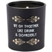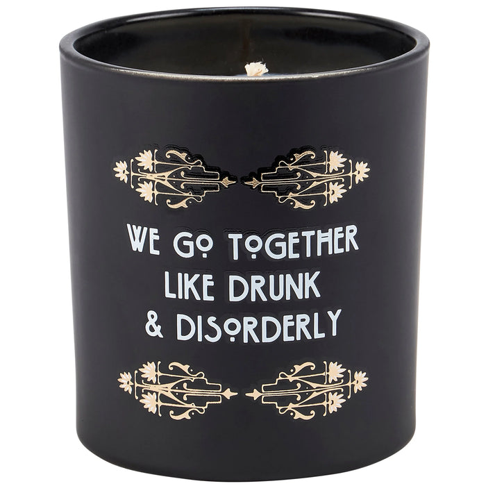 A candle from displaying an art deco inspired design with metallic gold accents on matte black glass as well as a fun alcohol inspired sentiment that reads "We Go Together Like Drunk And Disorderly." Art deco design is replicated from original hand illustrated artwork. Bar candle features soy-based wax and cotton wick with 35 hours of burn time activating an invigorating Gin scent. Our We Go Together candle includes a dust cover and plastic lid for protection and enhanced appearance on store displays. A stylish home accent that coordinates well with bar decor.
